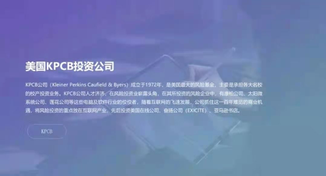 KPCB 公司(Kleiner Perkins Caufield & Byers)成立于 1972 年,是美国最大的风险基金,主要是承担各大名校的校产投资业务。