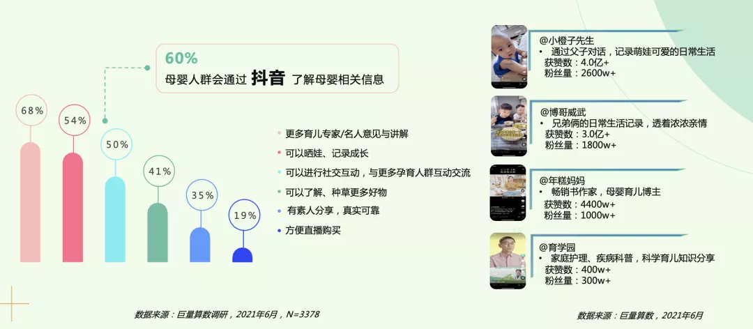 不同于过往凭“经验”为孩子购买用品的年代,当下时代的年轻父母在选购母婴用品时,更倾向于综合各方面的信息生成自我判断。在他们产生购买想法到收集品牌信息再到下单的过程中,其他宝爸宝妈的体验和推荐是重要的参考坐标。巨量算数2021年6月的调研数据佐证了这一趋势,有60%的用户会通过抖音了解母婴相关信息,专业的育儿专家和儿科医生的科普分享是吸引大家使用抖音、信任抖音的主要原因,同时他们也会关注素人分享的育儿日常生活。