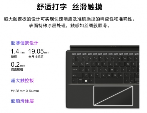 它拥有13.3寸屏幕搭配1.4mm键程的全尺寸键盘,无论是浏览文件还是办公打字都高质量还原笔记本的使用感受,约128mmX64mm超大触控板,让操控如鱼得水。